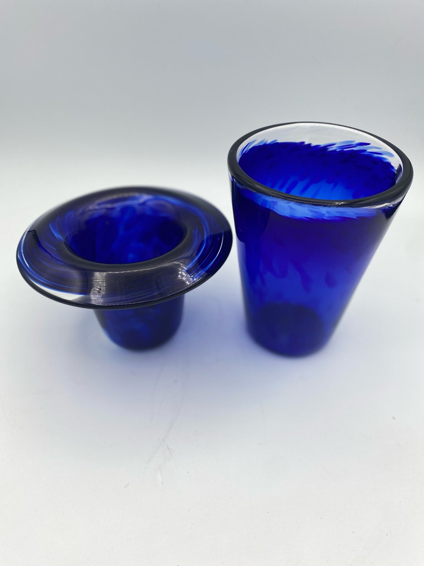 A handsome pair of handblown glass vases by Firebird artist, LA Biggs, in deep blue. Height & width left to right: " 3" x 5.5" and 5.5" x 4