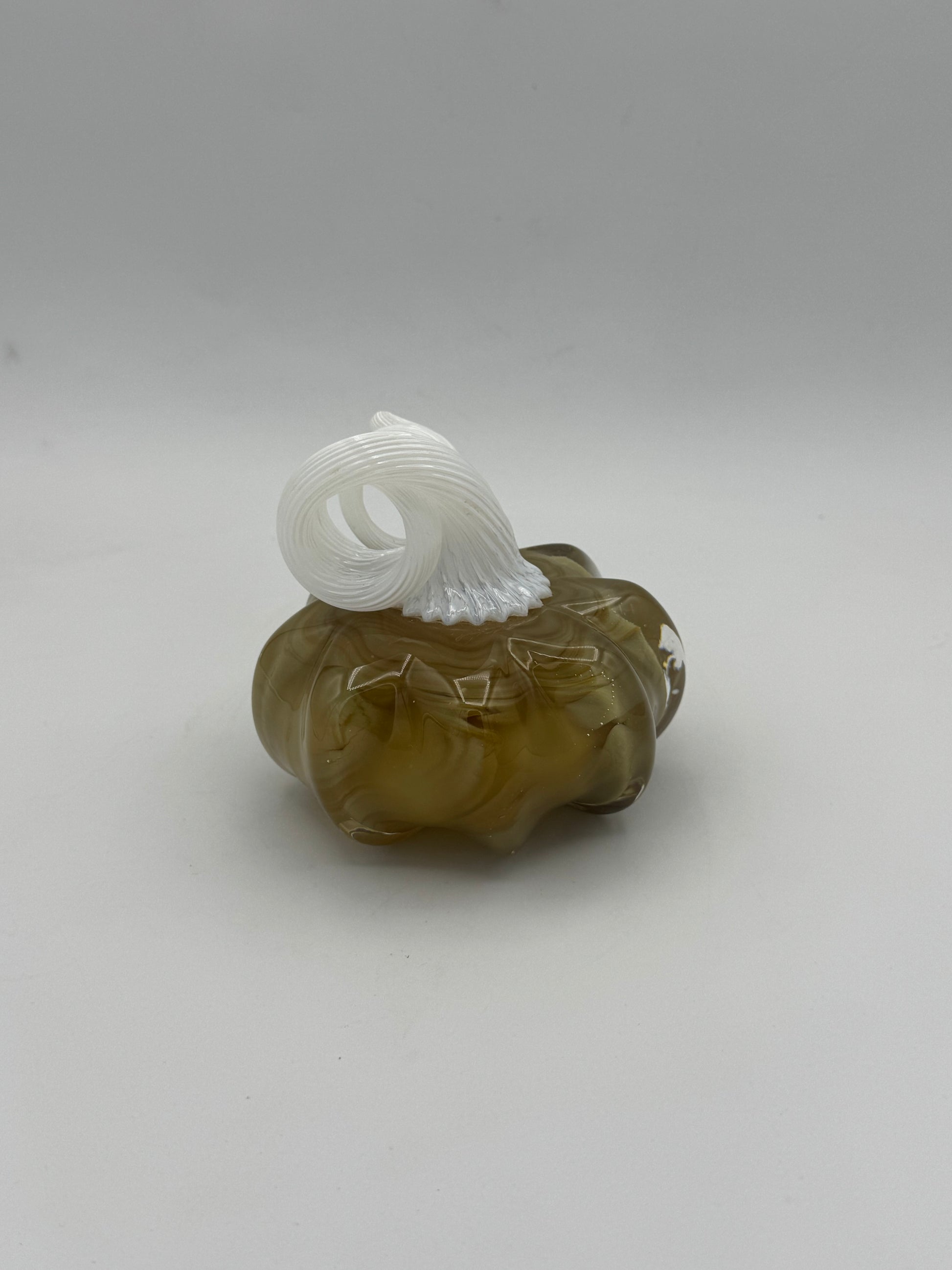 Celebrate autumn with our small handblown glass pumpkins made by our Project FIRE young artists. Each pumpkin is uniquely created and will vary slightly. Measures 4" x 4".