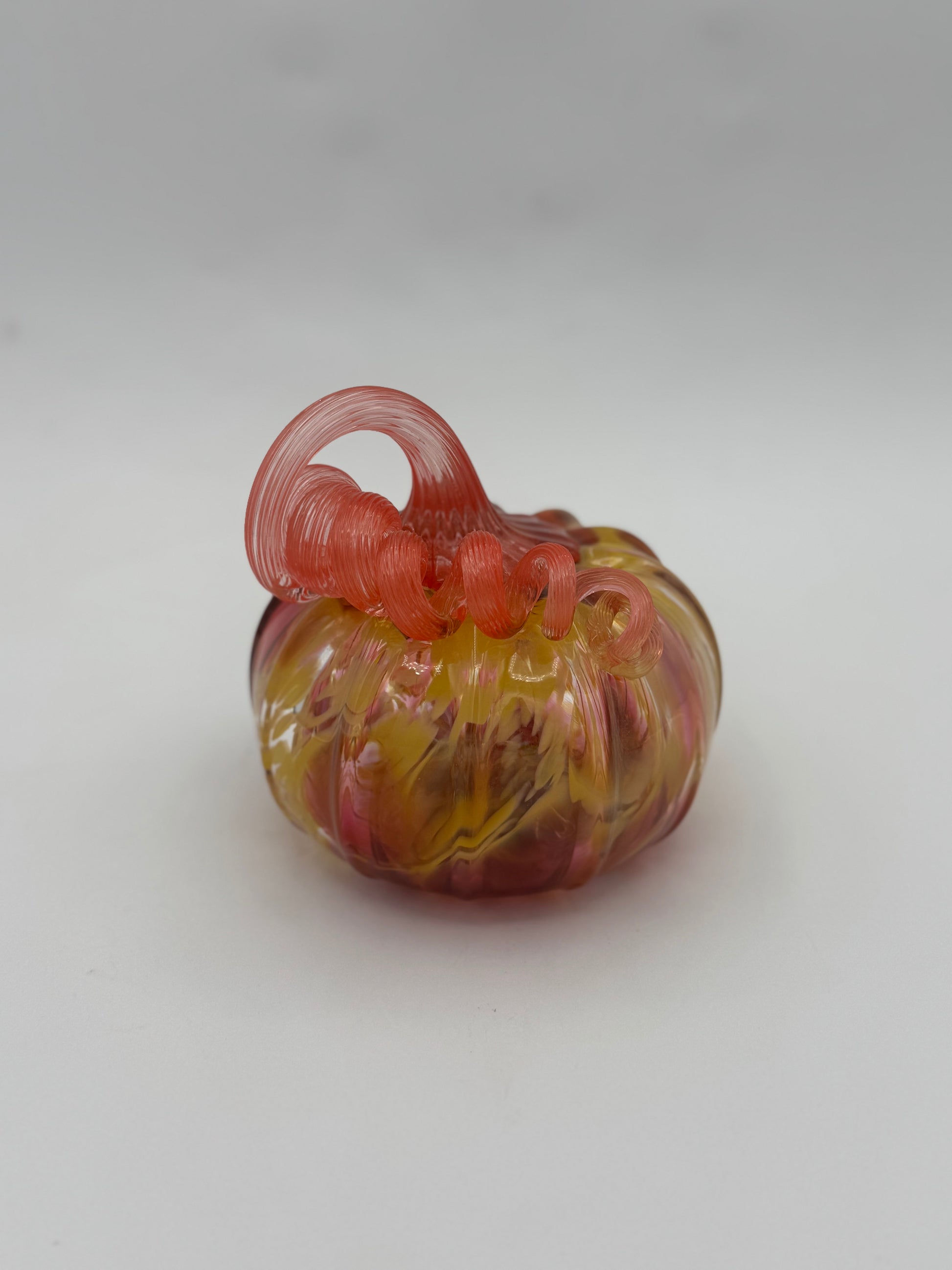 Celebrate autumn with our small handblown glass pumpkins made by our Project FIRE young artists. Each pumpkin is uniquely created and will vary slightly. Measures 5" x 5".
