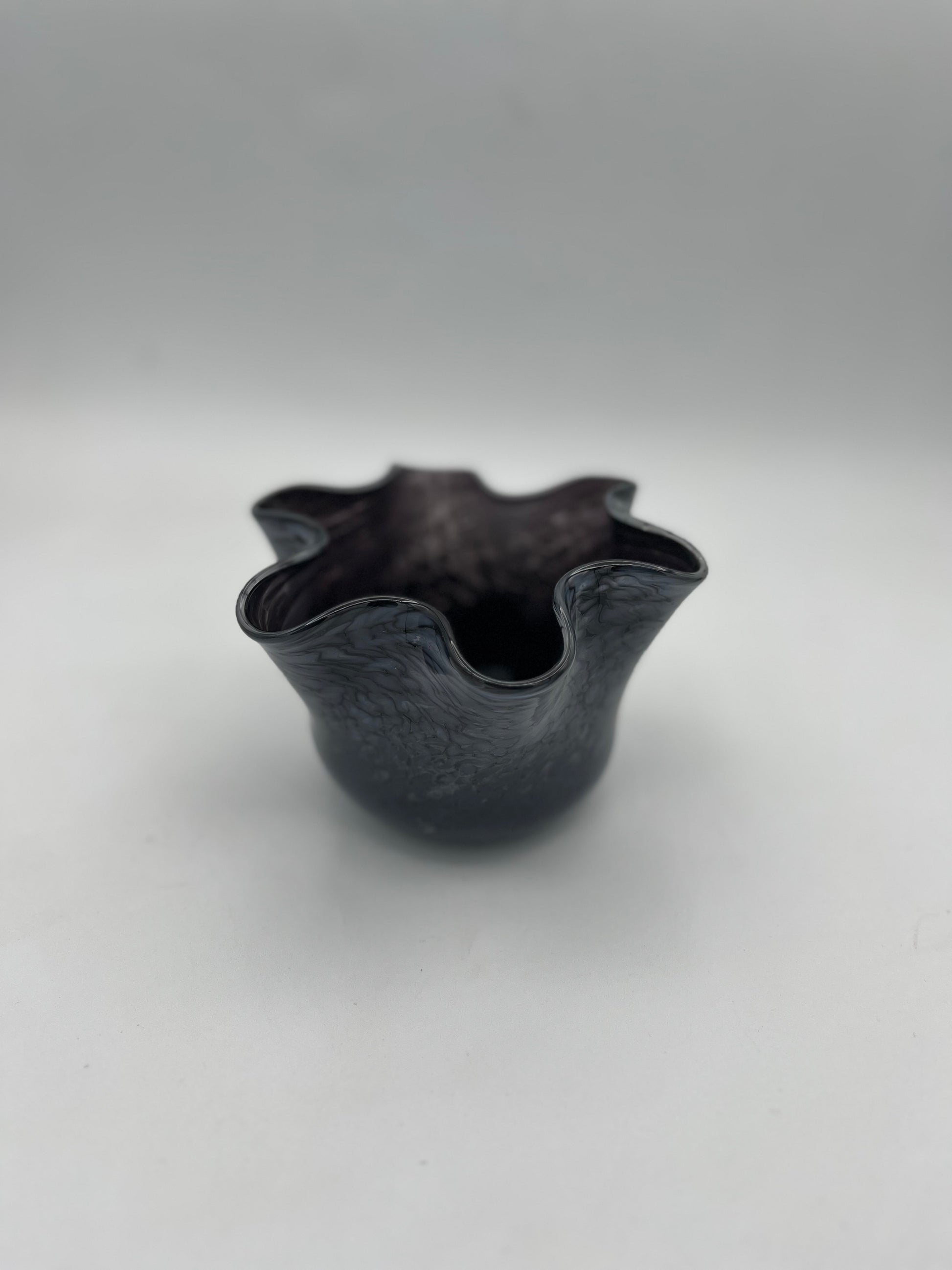 This charming handblown glass vase by Firebird artist, Trevelli Jones, in pale blue stands 3.5" tall and 2.5" wide.